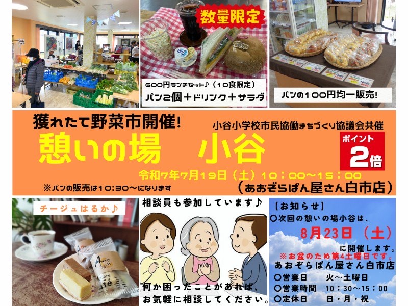 「憩いの場小谷」8月の野菜販売日が盆とかさなるため変更します!